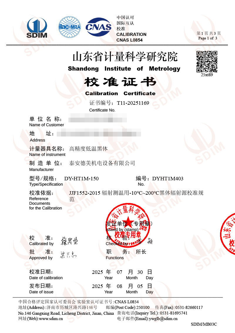 高精度低溫黑體(-10-100℃)校準證書 2025-8-6 本文被閱讀 2215 次