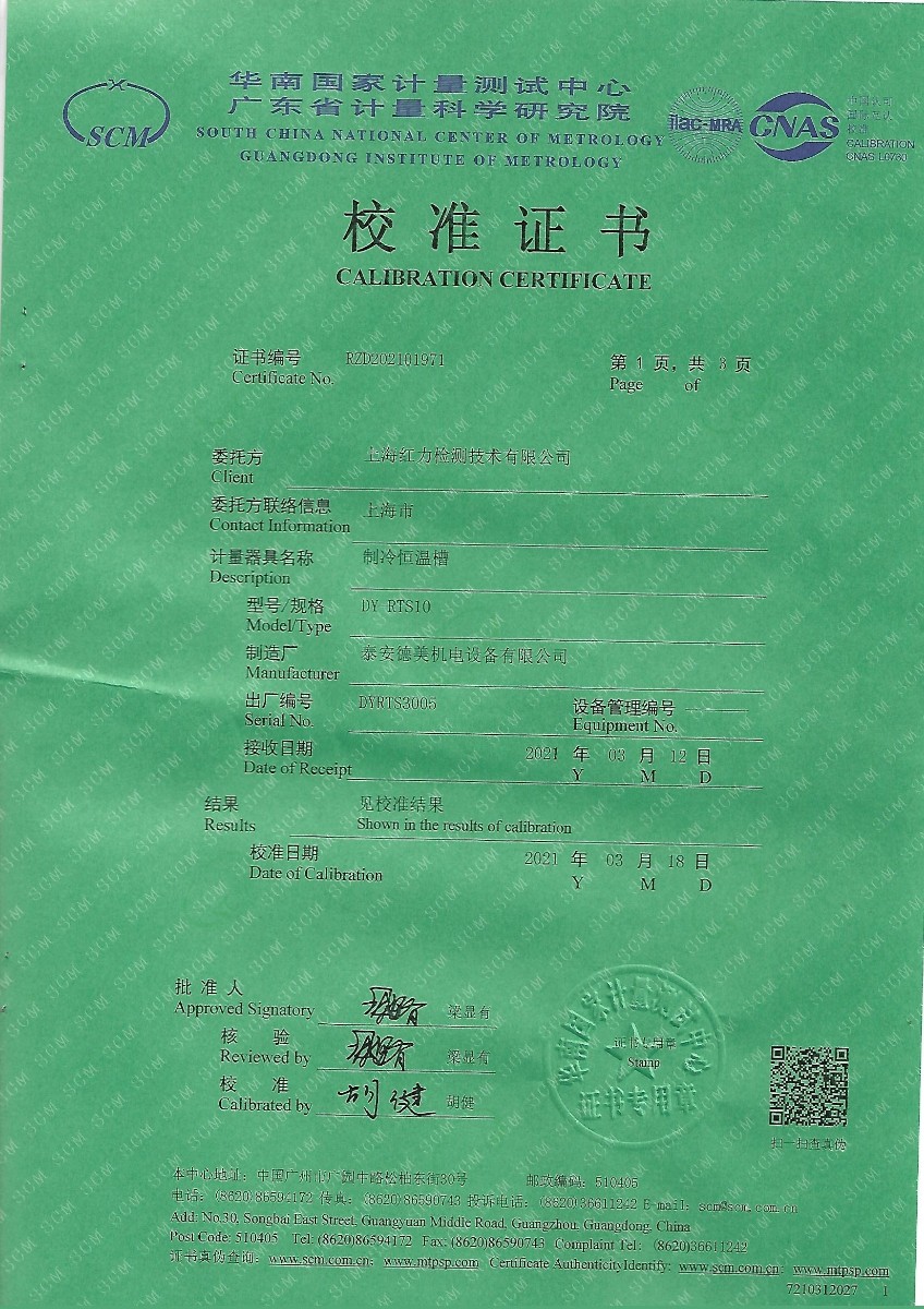 | 上一條:西安電子科技有限責(zé)任公司-智能高精度制冷恒溫槽 | 下一條:溫濕度檢定箱(-5~65℃)校準(zhǔn)證書 |
