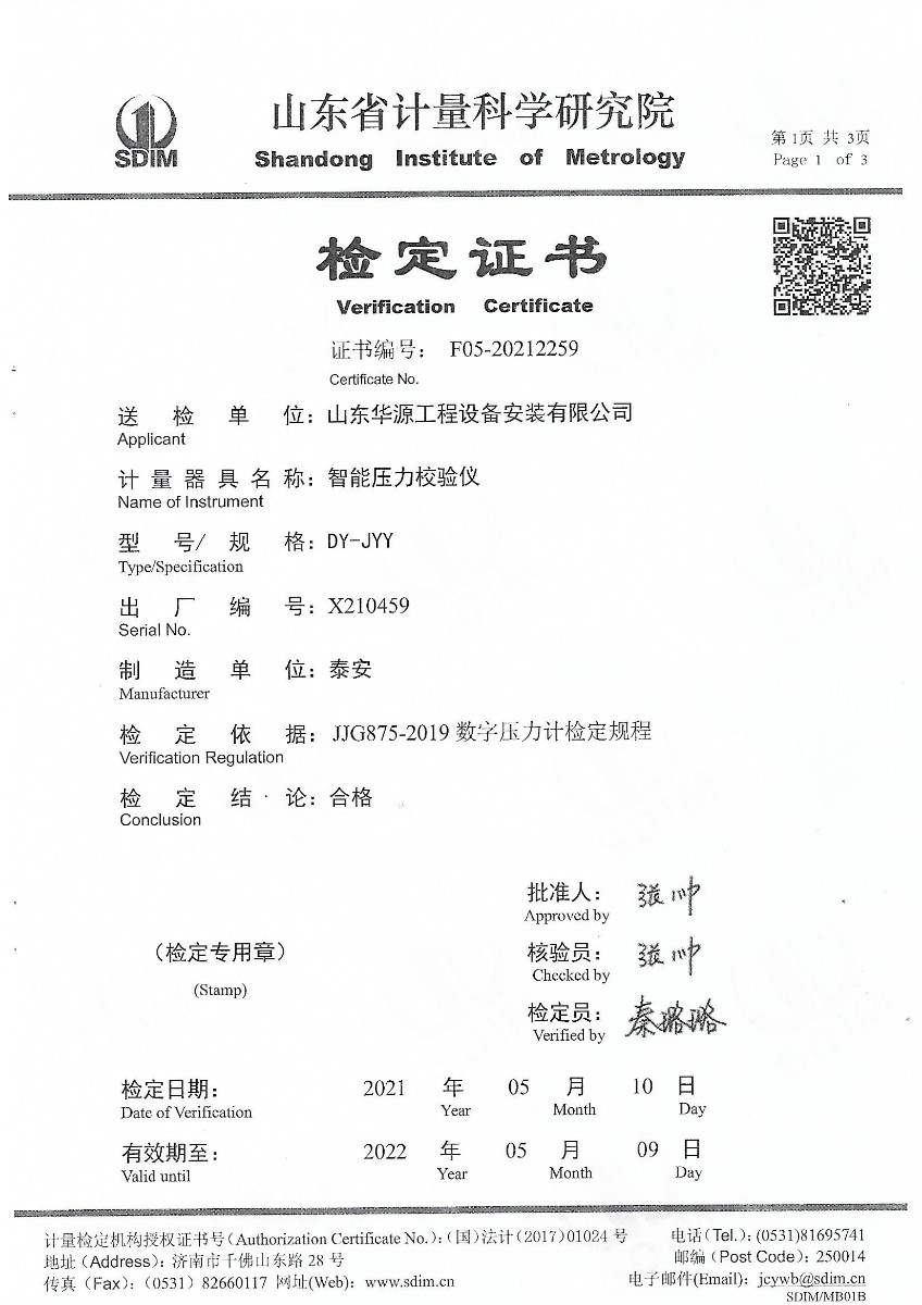 | 上一條:山東華源工程設(shè)備安裝有限公司-智能壓力校驗(yàn)儀X210458 | 下一條:便攜式干體爐(-30-150℃)校準(zhǔn)證書(shū) |