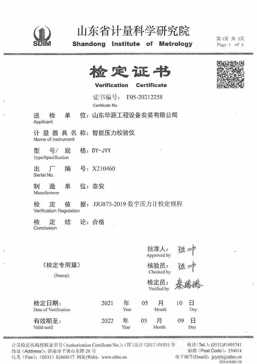 | 上一條:山東華源工程設(shè)備安裝有限公司-智能壓力校驗(yàn)儀X210459 | 下一條:便攜式干體爐(-30-150℃)校準(zhǔn)證書(shū) |