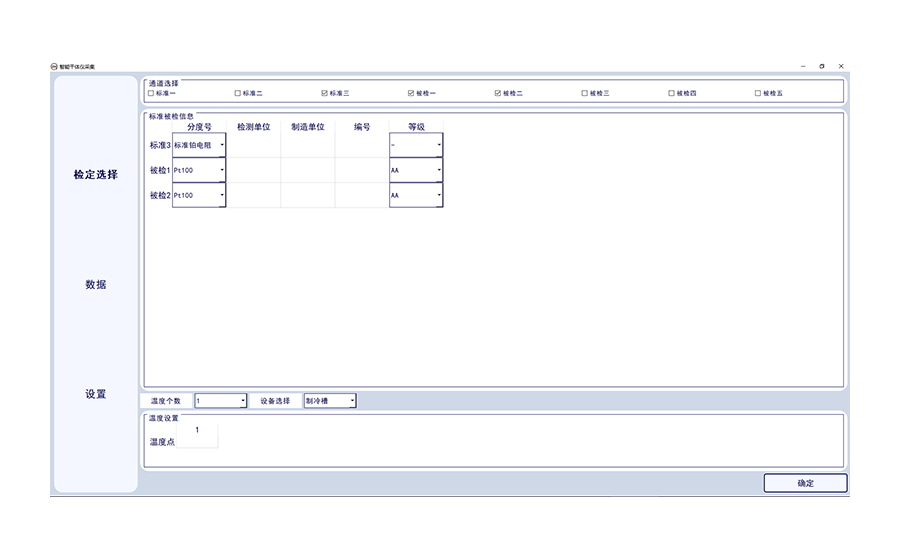 1.可實(shí)現(xiàn)設(shè)備的8通道的任意檢定選擇,可選擇通道的分度號(hào)類型,及被測傳感器的檢測單位、制造單位,傳感器編號(hào)及等級(jí)