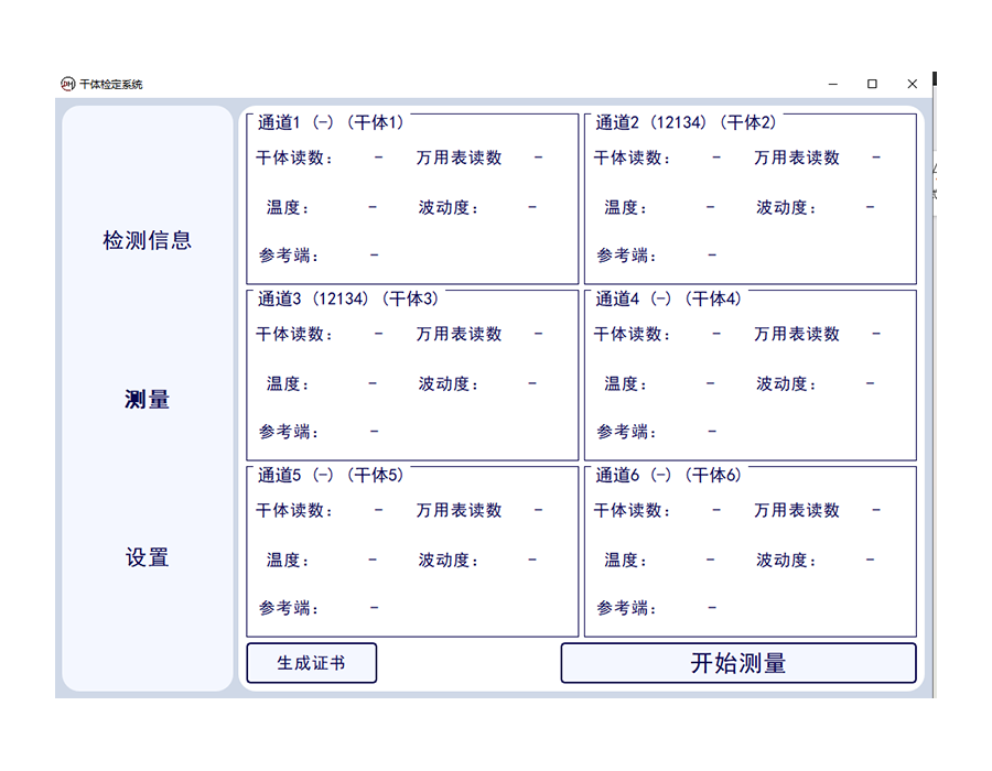 測(cè)量狀態(tài)可進(jìn)行多通道狀態(tài)干體爐,萬(wàn)用表讀數(shù)。當(dāng)前標(biāo)準(zhǔn)器溫度,溫度波動(dòng)性等數(shù)據(jù)的讀取,并一鍵生成證書(shū)。可實(shí)現(xiàn)一鍵中英文切換。