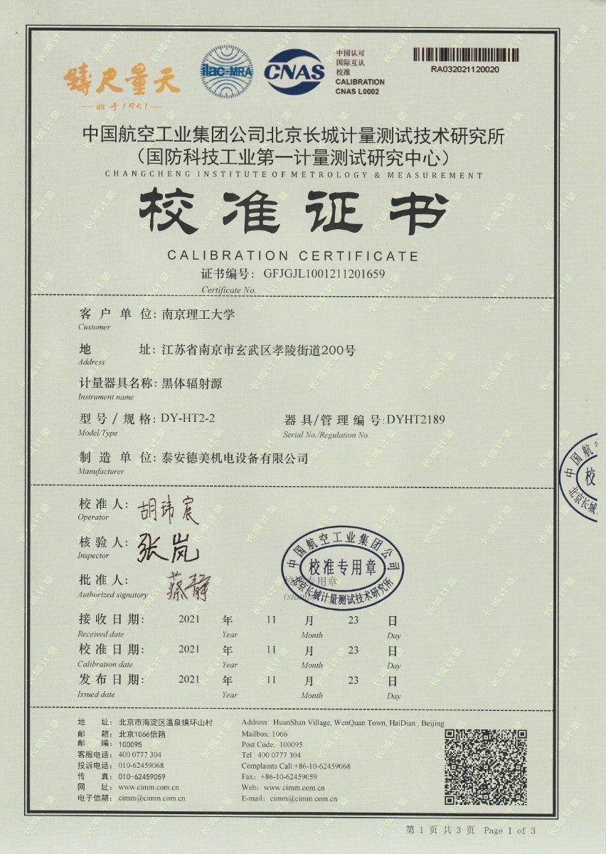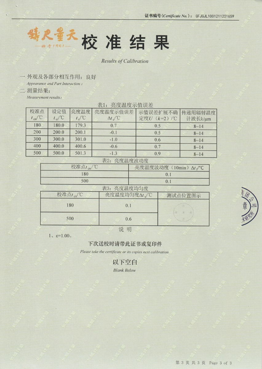 | 上一條:南京理工大學(xué)-黑體輻射源校準(zhǔn)證書40-250℃ | 下一條:便攜式干體爐(-30-150℃)校準(zhǔn)證書 |
