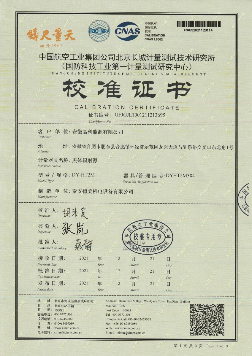 安徽晶科能源有限公司-黑體輻射源 2022-1-4 本文被閱讀 14543 次