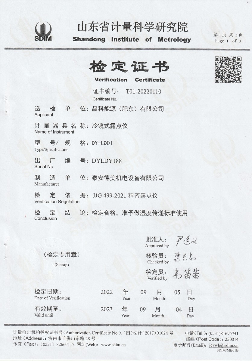 上一條:晶科能源(肥東)有限公司-溫濕度檢定箱 | 下一條:超低溫面源黑體爐(-40-80℃)校準(zhǔn)證書 |