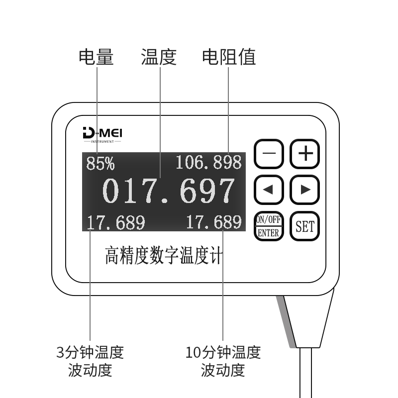功能 | 實時顯示當(dāng)前溫度、電量顯示、電阻值、溫度波動 度、10分鐘溫度波動度自動跟蹤計算、測試功能 | |