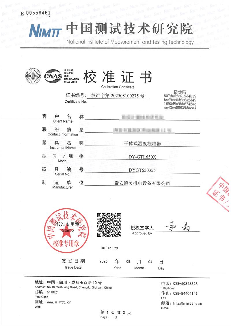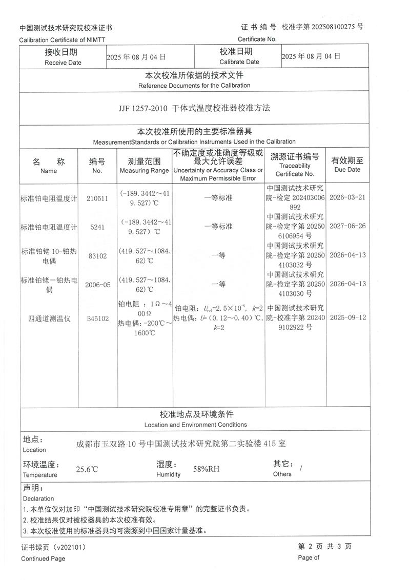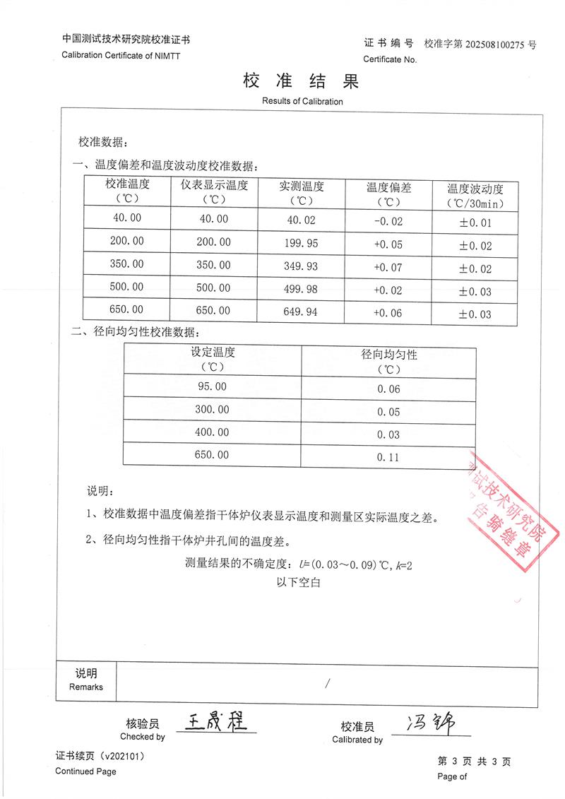 干體式溫度校準器(40~650℃)校準證書 2025-8-6 本文被閱讀 1720 次
