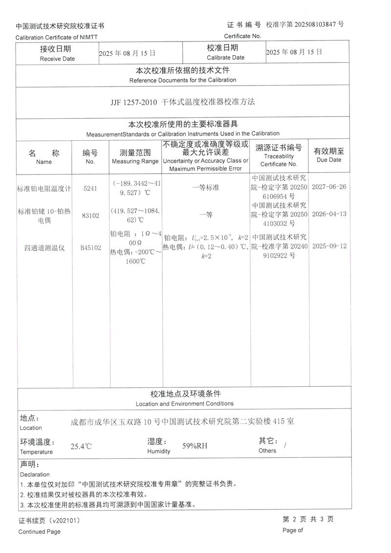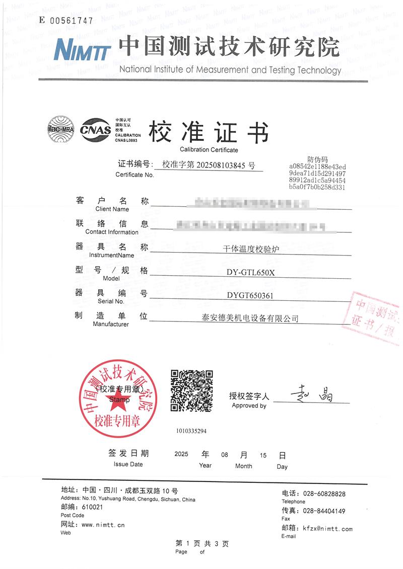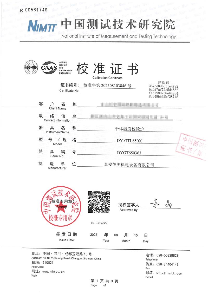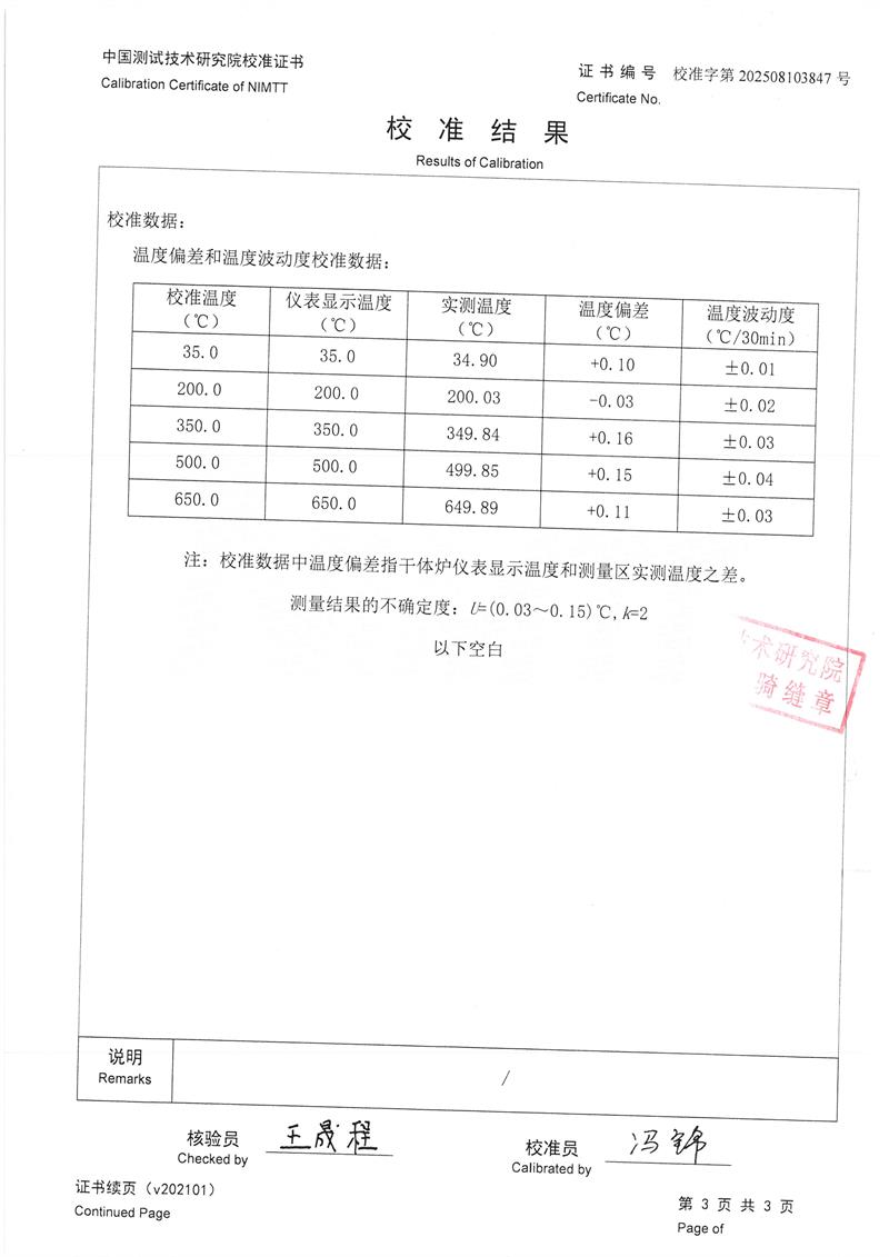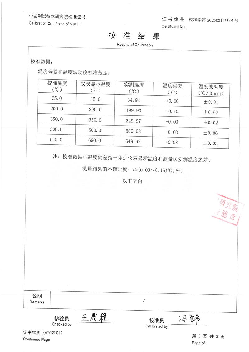 干體爐(室溫+5℃~650℃)校準(zhǔn)證書(shū) 2025-8-20 本文被閱讀 1876 次