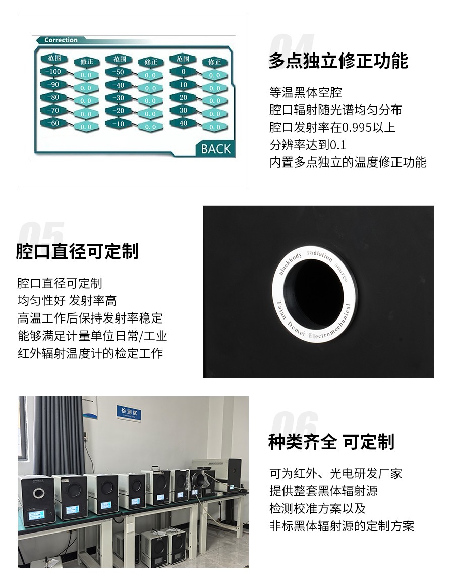 標(biāo)準(zhǔn)黑體作為標(biāo)準(zhǔn)輻射源,主要用于校準(zhǔn)輻射溫度計、紅外溫度計和輻射溫度傳感探測器。我公司目前具有先進的黑體技術(shù),產(chǎn)品種類全、溫度范圍寬的黑體系列產(chǎn)品。產(chǎn)品體積小、重量輕、便于攜帶,不僅適合各級計量機構(gòu)實驗室校準(zhǔn)輻射溫度計使用,同時可以用于現(xiàn)場校準(zhǔn)。