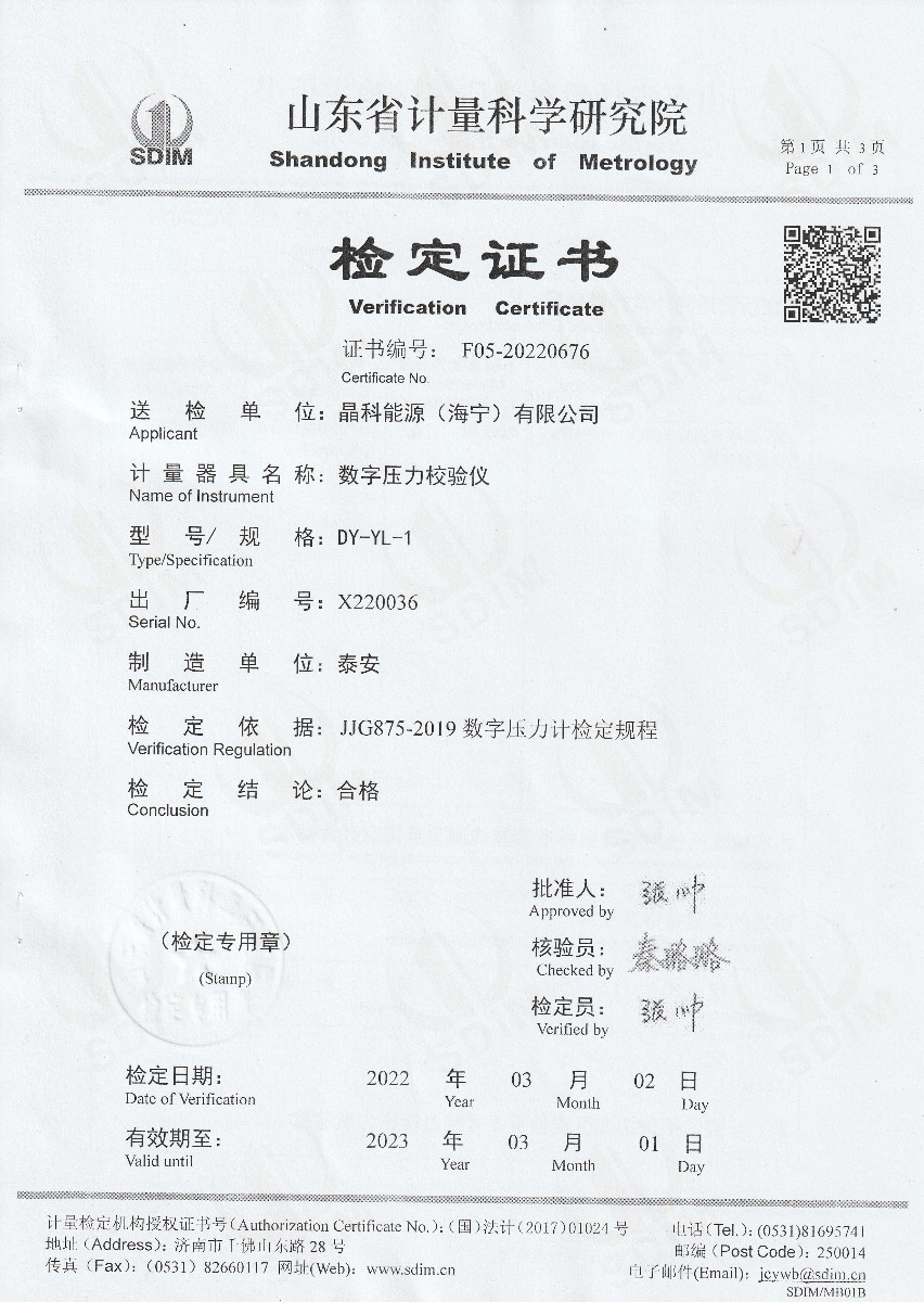 晶科能源(海寧)有限公司-數字壓力計校驗儀 2022-3-16 本文被閱讀 11869 次