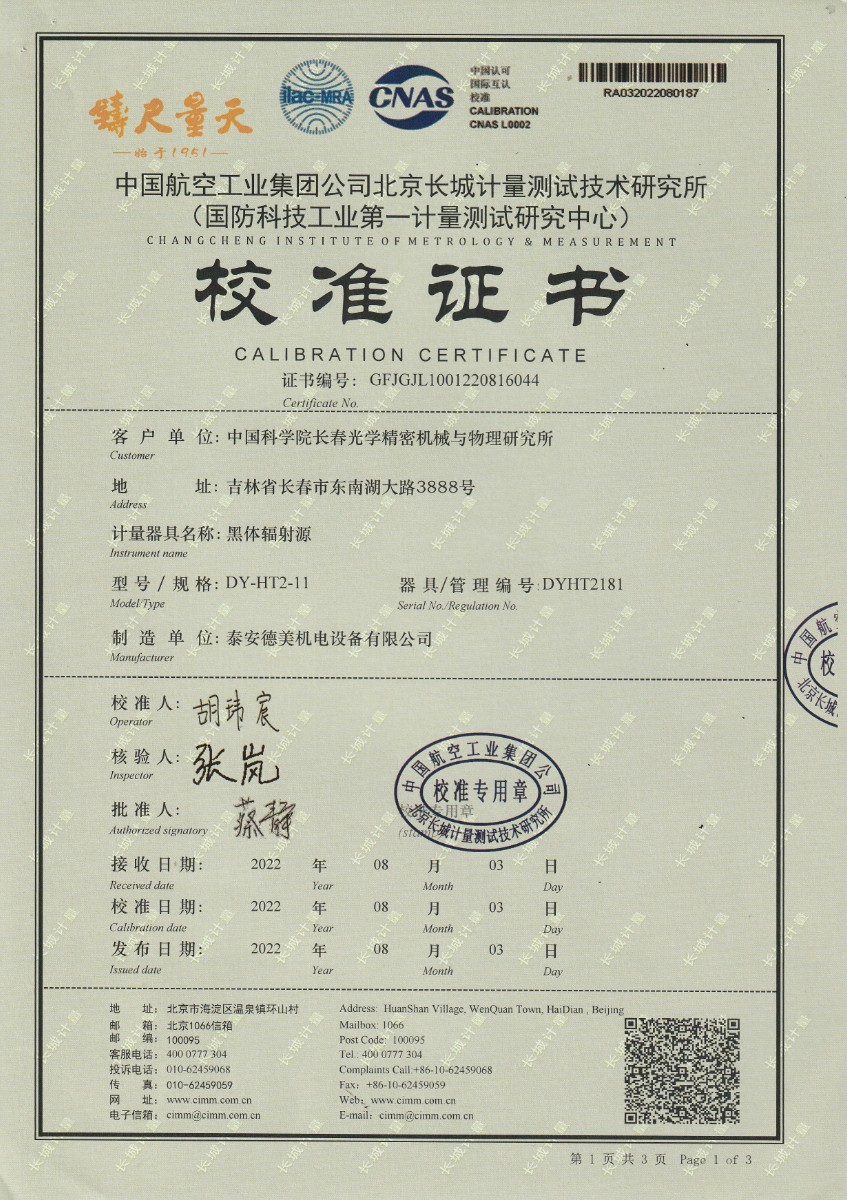 上一條:中國科學(xué)院長春光學(xué)精密機(jī)械與物理研究所-黑體爐DY-HT2-2 | 下一條:超低溫面源黑體爐(-40-80℃)校準(zhǔn)證書 |