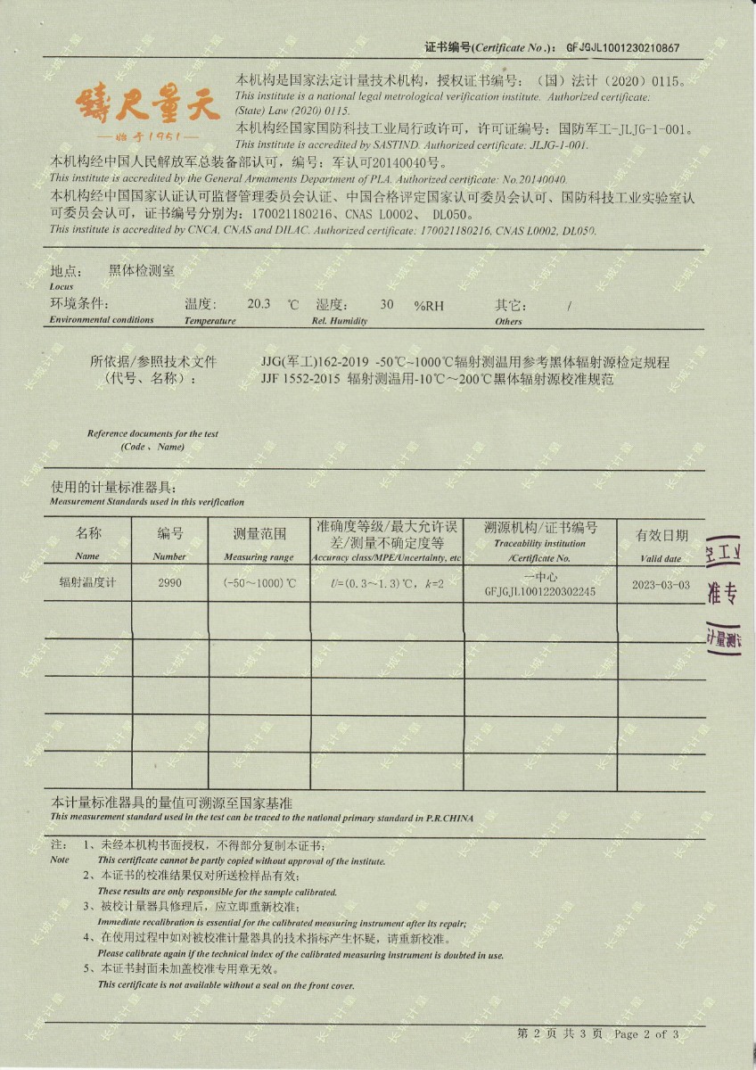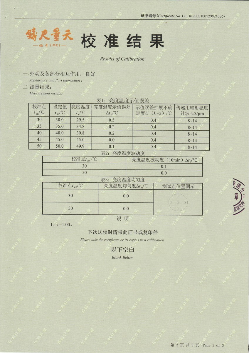 上一條:江蘇省產(chǎn)品質(zhì)量監(jiān)督檢驗研究院 黑體輻射源 校準(zhǔn)證書 | 下一條:超低溫面源黑體爐(-40-80℃)校準(zhǔn)證書 |
