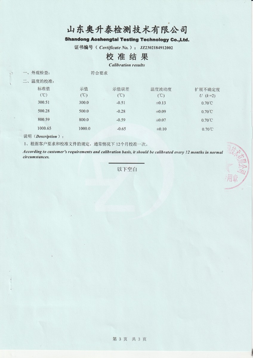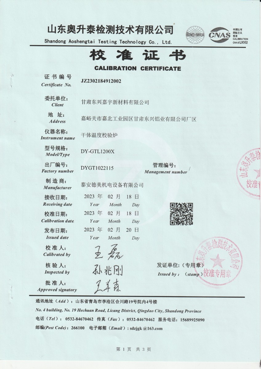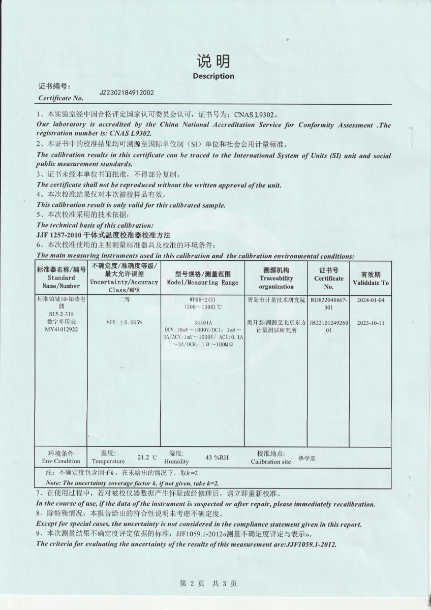 上一條:甘肅東興嘉宇新材料有限公司 干體溫度校驗爐 校準(zhǔn)證書(1) | 下一條:超低溫面源黑體爐(-40-80℃)校準(zhǔn)證書 |
