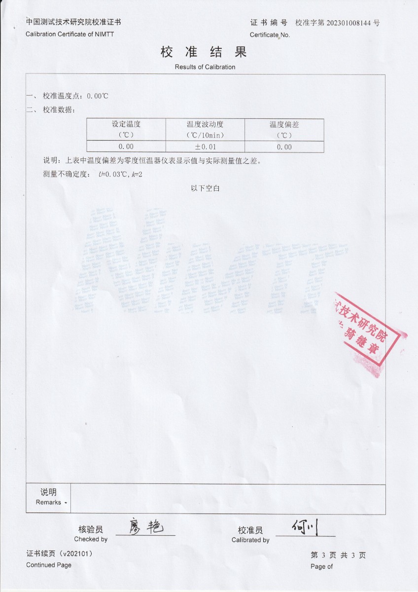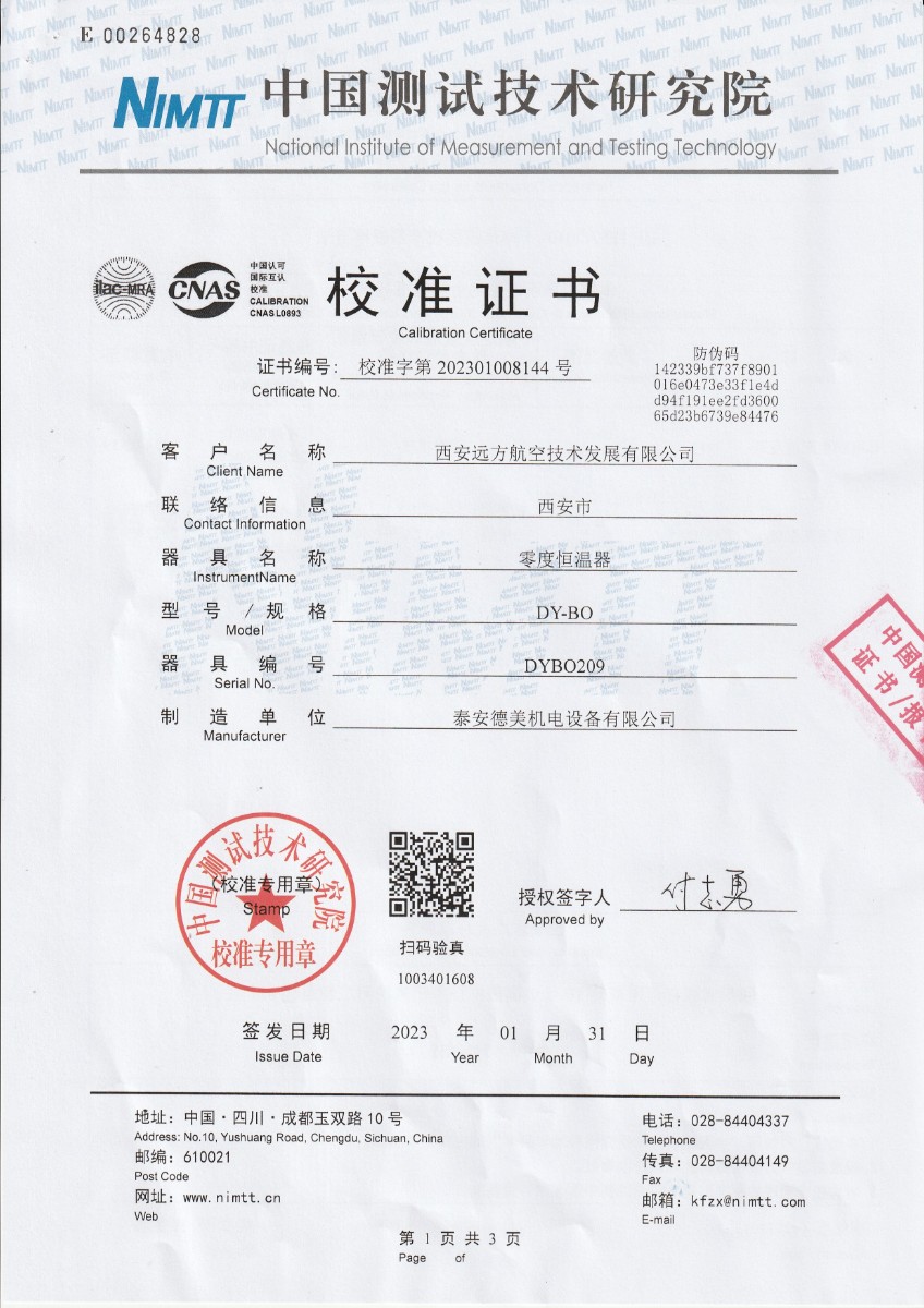 西安遠方航空技術發(fā)展有限公司 零度恒溫器 校準證書 2023-4-10 本文被閱讀 13654 次
