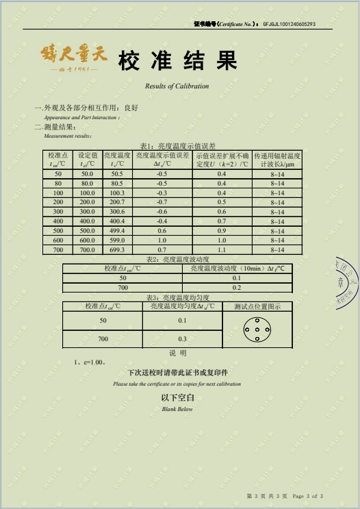 黑體輻射源(50-700℃)304所校準(zhǔn)證書