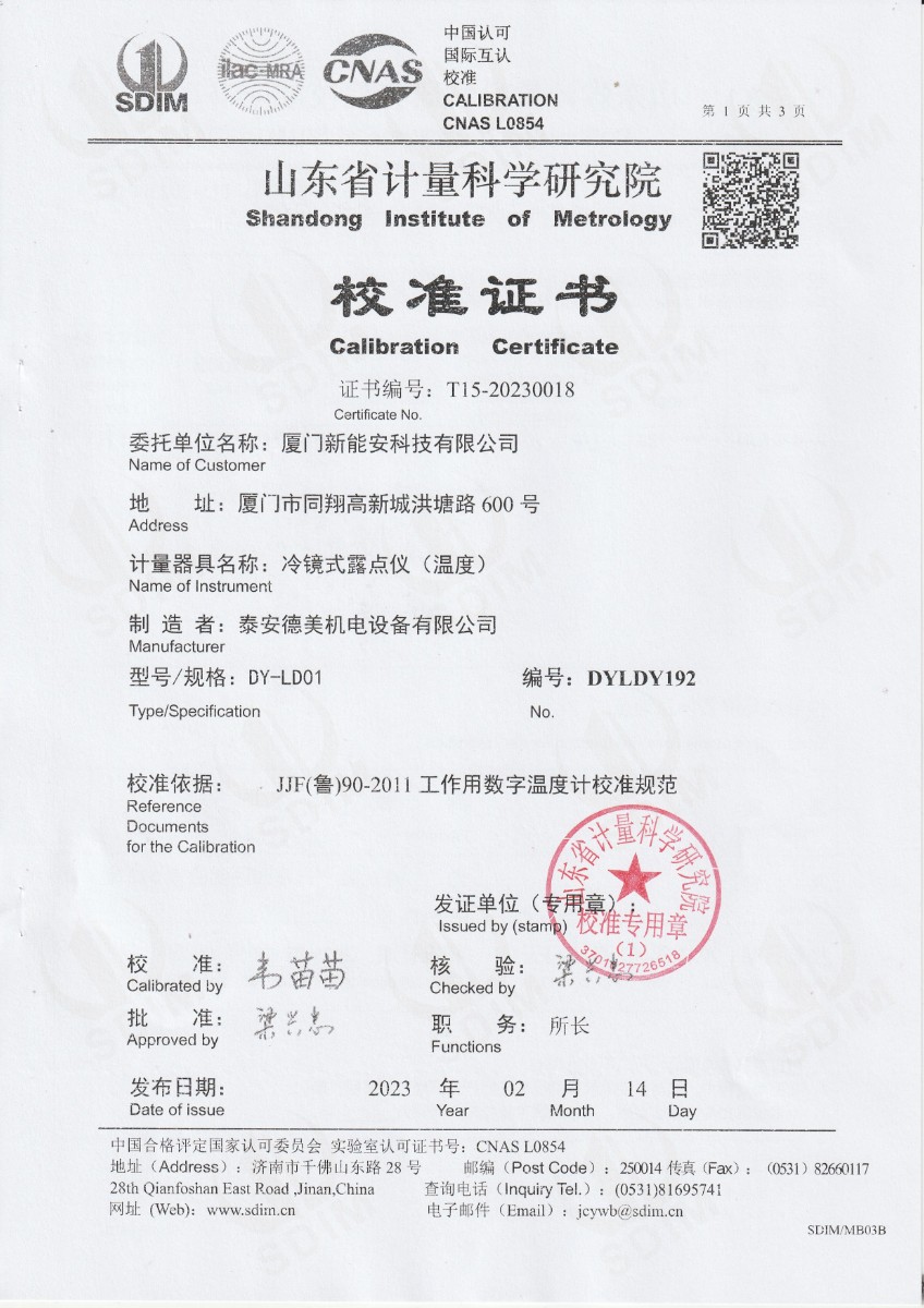 | 上一條:廈門新能安科技有限公司 冷鏡式露點儀 檢定證書 | 下一條:便攜式干體爐(-30-150℃)校準(zhǔn)證書 |