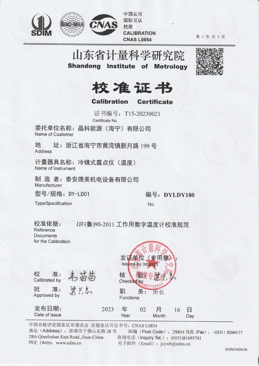 | 上一條:晶科能源(海寧)有限公司 冷鏡式露點(diǎn)儀 檢定證書 | 下一條:便攜式干體爐(-30-150℃)校準(zhǔn)證書 |