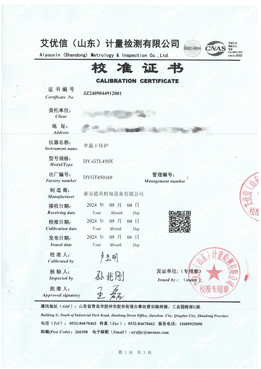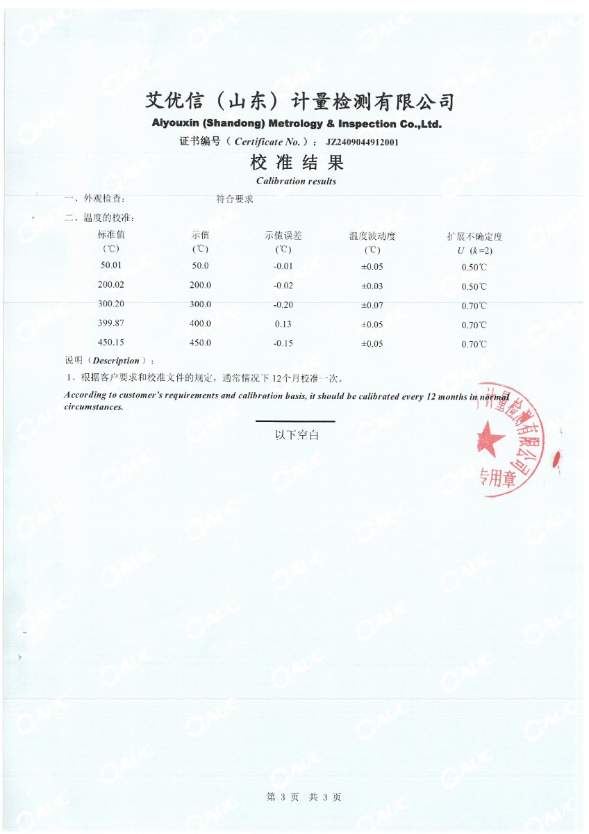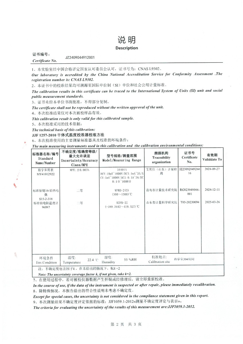 中溫干體(50~450℃)校準證書 2024-9-18 本文被閱讀 6283 次