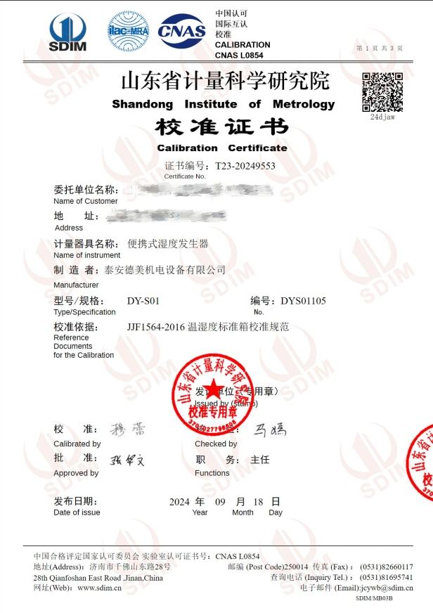 便攜式濕度發(fā)生器(5~50℃)校準(zhǔn)證書