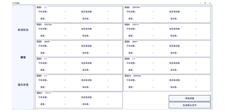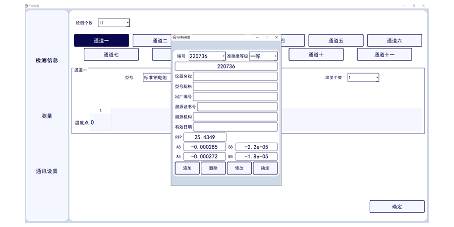 此套軟件可讀取1-11路標(biāo)準(zhǔn)通道的數(shù)字萬(wàn)用表的電壓數(shù)值,標(biāo)準(zhǔn)溫度值,并一鍵轉(zhuǎn)換溫度值,并實(shí)現(xiàn)溫度波動(dòng)度計(jì)算,可確定干體溫度校驗(yàn)爐與標(biāo)準(zhǔn)器溫度的差值。可一鍵生成證書數(shù)據(jù)。