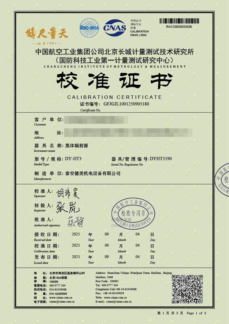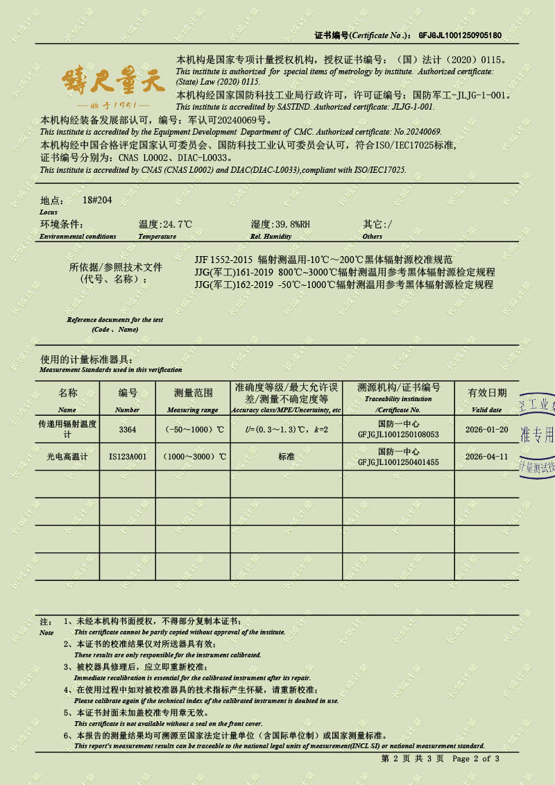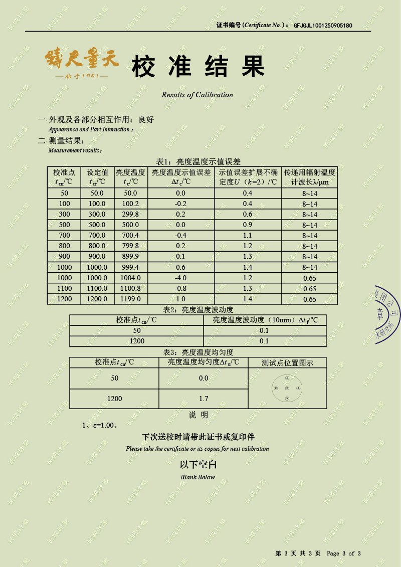 黑體輻射源(50-1200℃)校準證書 2025-9-22 本文被閱讀 629 次