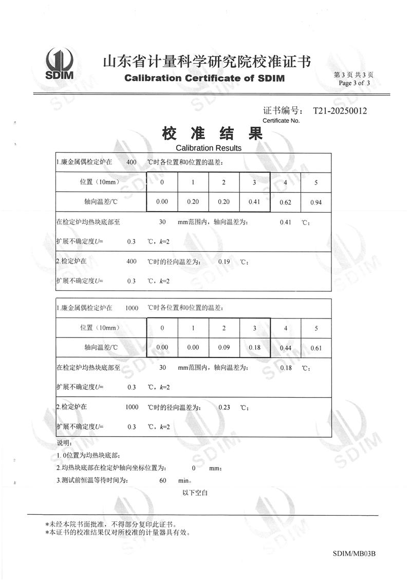 廉金屬熱電偶檢定爐(300~1200℃)校準證書 2025-2-26 本文被閱讀 4157 次