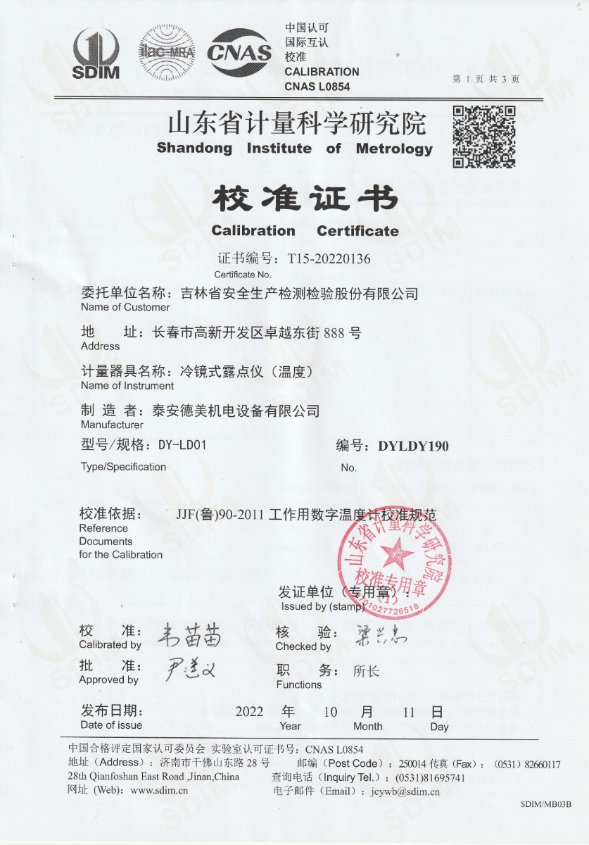 吉林省安全生產(chǎn)檢測檢驗股份有限公司-冷鏡式露點儀校準證書 2022-10-20 本文被閱讀 12424 次