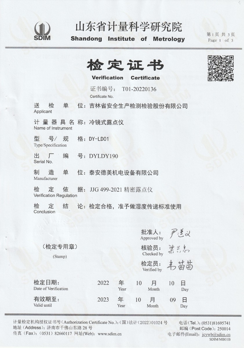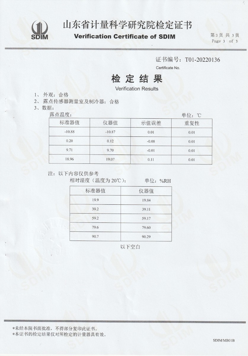 | 上一條:吉林省安全生產(chǎn)檢測檢驗(yàn)股份有限公司-冷鏡式露點(diǎn)儀校準(zhǔn)證書 | 下一條:便攜式干體爐(-30-150℃)校準(zhǔn)證書 |