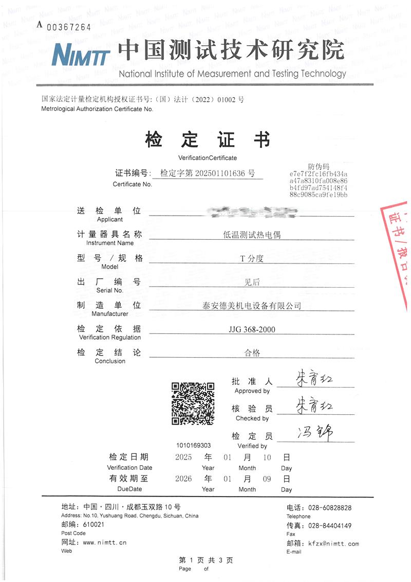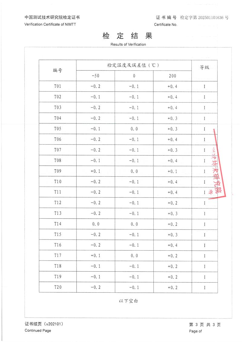 (T型)低溫測試熱電偶檢定證書 2025-1-13 本文被閱讀 5140 次
